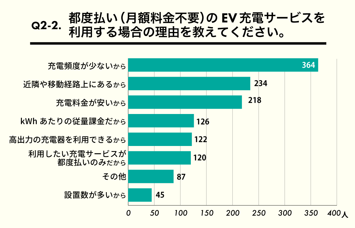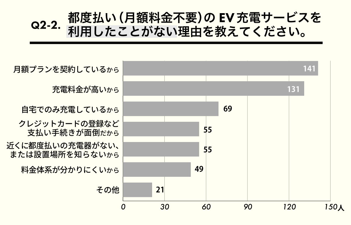 一方、都度払いのEV充電サービスを利用したことがないと回答した約3割の方のうち、最も多かった理由が「月額プランを契約しているから」。月額プランを契約している方にとっては、月額プラン内での充電器利用がおトクなため、都度払いの充電サービスは「充電料金が高い」と感じることも多いようです。