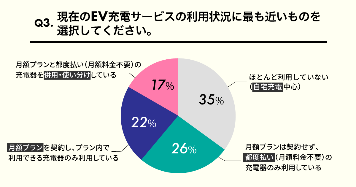 今回のアンケートでは、利用可能な充電スタンド数の多さや充電料金のおトク感から月額プランを選択する方もいれば、月額不要の都度払いサービスを“使いやすい選択肢”と捉える方もいて、用途やライフスタイルに応じて、最適なEV充電サービスを選んで活用する様子が見えてきました。