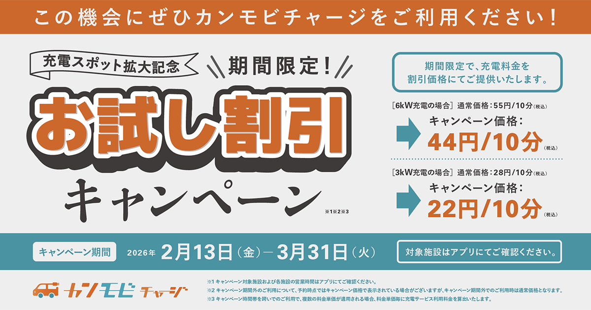 現在、関西電力が提供するEV充電サービス「カンモビチャージ」では、充電スポット拡大を記念して「お試し割引キャンペーン」を実施中!